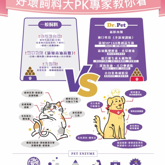 成分:MP-168(芽孢乳酸菌、羅伊氏乳桿菌、納豆菌、紅麴)、澳洲雞肉、澳洲牛肉、台灣鴨肉、鰹魚、鮪魚、阿拉斯加鱈魚油、鳳梨酵素、木瓜酵素、大豆卵磷脂、天然酵母粉、碳酸鈣、綜合維生素(A、D、E、K、B1、B2、B6、B12、葉酸、牛磺酸、β胡蘿蔔素)、綜合礦物質。