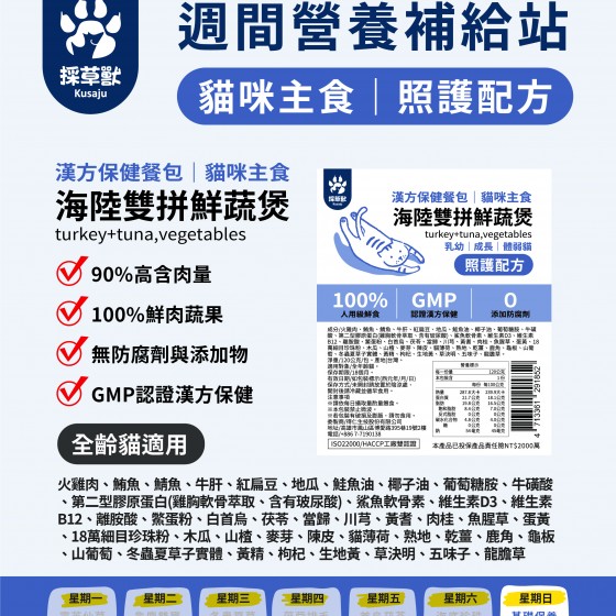 貓海陸主食低脂強照護配方 嚴選台灣在地蔬果,不加一滴水,使用人食用同等級肉源,專業營養師配方,豐富多元微量元素配方,添加GMP複方漢方安心保健,除一般正常飲食貓咪外,對於體弱,發育加強,腸胃道不適等,特別冬蟲夏草離胺酸增強免疫力,增強腸胃道保健及卵磷脂亮毛護毛育毛,更補強增加牛磺酸,讓眼睛,神經系統心臟,消化道系統全方面能獲得更好的吸收成長