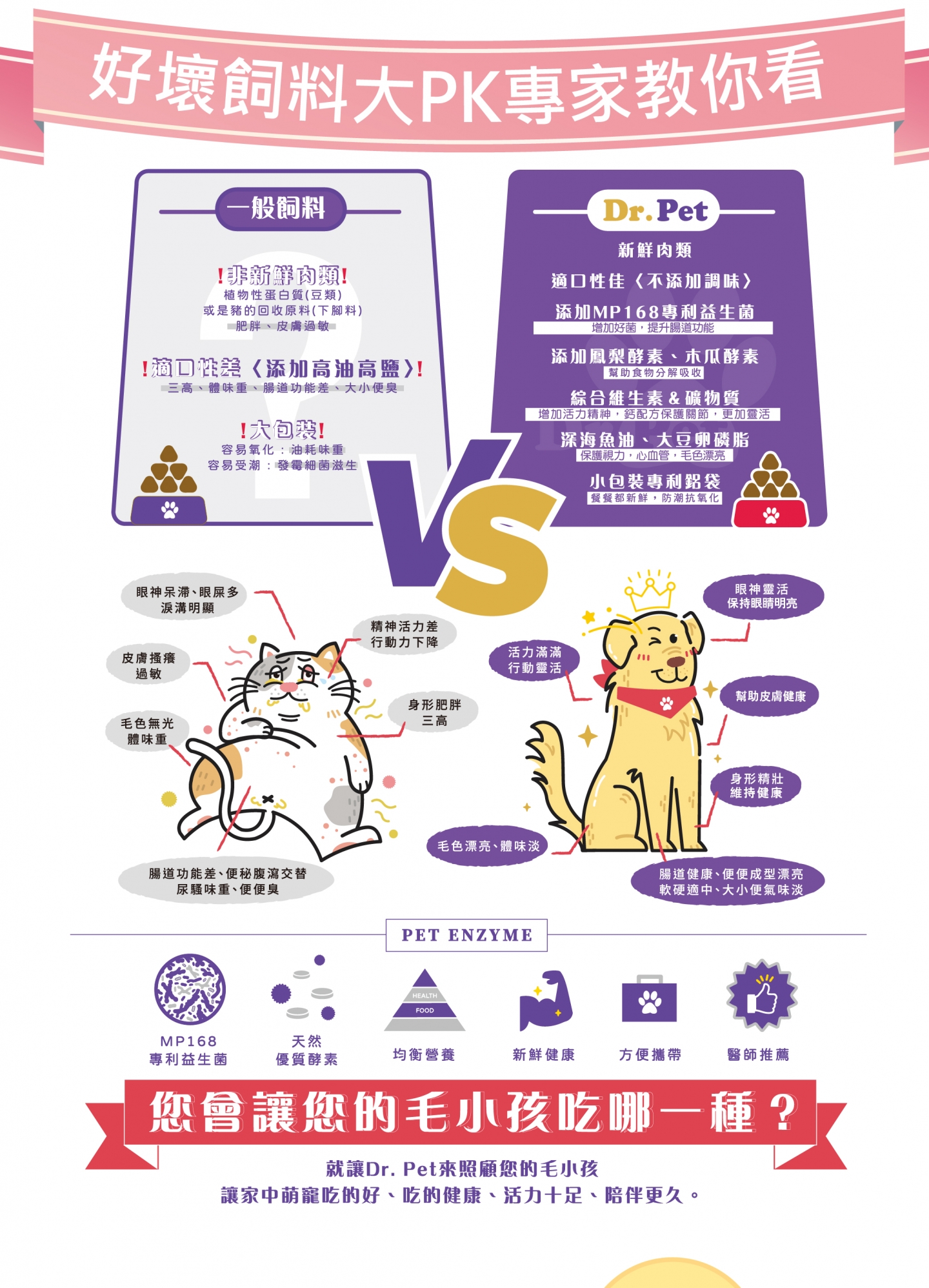 成分:MP-168(芽孢乳酸菌、羅伊氏乳桿菌、納豆菌、紅麴)、澳洲雞肉、澳洲牛肉、台灣鴨肉、鰹魚、鮪魚、阿拉斯加鱈魚油、鳳梨酵素、木瓜酵素、大豆卵磷脂、天然酵母粉、碳酸鈣、綜合維生素(A、D、E、K、B1、B2、B6、B12、葉酸、牛磺酸、β胡蘿蔔素)、綜合礦物質。